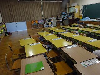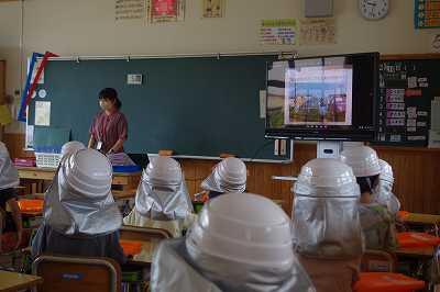 実際の竜巻接近を想定し、子どもたちは机を廊下側に寄せ、帽子をかぶり、机の下に身を伏せ安全姿勢をとって、竜巻が通り過ぎるのを待ちました。どの学級もおしゃべりをせず、真剣に取り組みました。