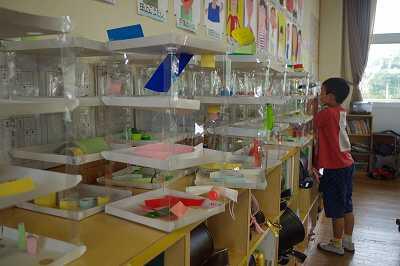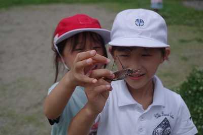 下の写真は、昼休み「先生、キリギリスを見つけました~。」と見せに来てくれた子達。バッタとキリギリスの違いが見分けられますか?写真は触覚が長いから、バッタじゃなくてキリギリスかな。さすが!