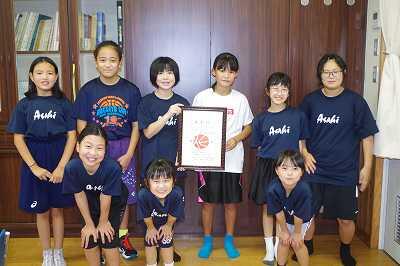 先日、旭小の男女バスケ部のみんなが、校長室に入賞報告に来てくれました。