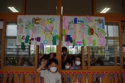 折り紙を使って、貝飾りや三角つづり、提灯などを作り、大きな笹にたくさんの飾りを付けました。その後、短冊に1年生ひとりひとりの願い事を書きました。