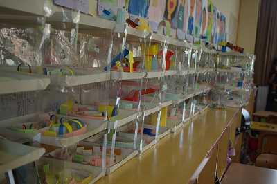 4年生の教室のカバン棚の上に立ち並ぶ、まるでビル群。図工の作品だそうです。その名も「コロコロガーレ」。ビー玉を転が仕組みを使った立体迷路ですね。楽しく遊べそうです。