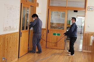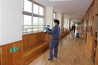 旭小の皆さんが元気に登校してくれることを、先生たちは楽しみにしています。業者の方による本格的な消毒