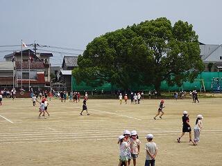 令和4年6月17日(金)、梅雨中の貴重な晴れ間、子ども達は蒸し暑いけど元気に運動場で遊んでいます。