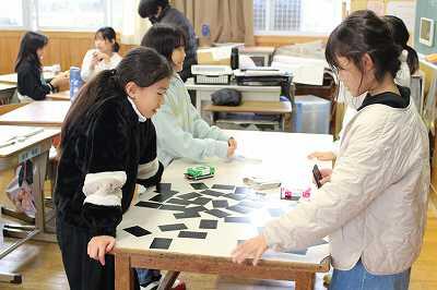 2年生が、算数で、箱の形について勉強していました。箱を使って、辺、面、ちょう点などの言葉を押さえたり、面を紙に写して切ってその形を確認したりしていました。はげまし隊の方々にも、勉強のお手伝いをして頂いています。