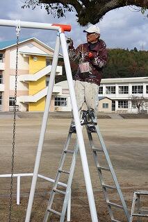 12月22・23日に、「修栄」代表 新名修様が来られて、ブランコをきれいに塗り上げてくださいました。新名様は10数年前から延岡市内の学校を回って、ボランティアで遊具のペンキ塗りを続けられていると伺いました。本校の別の遊具も以前塗っていただいており、また昨年度から続けて来ていただいているようです。本当に有り難いです。