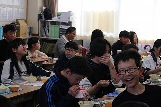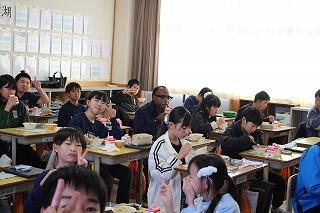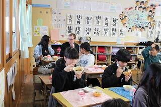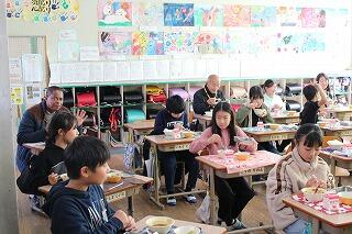 給食の時間は、お一人ずつ5・6年生の教室へ入っていただき、一緒に給食を食べていただきました。メニューは「ハヤシライス、ツナサラダ、ご飯、牛乳」でしたが、どのクラスもマナーを守っておいしくいただいていましたよ。