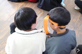 ここでは、「宝探し」の宝を教室の中に隠しているところです。隠す役と探す役を交代しているようで、友達が隠すのを廊下のベンチに腰かけて待っています。待ち方がとてもかわいい旭っ子です。