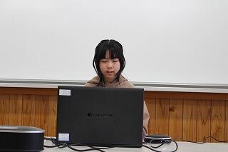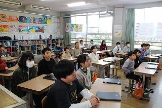 作文発表を教室で聞いている1年生の様子です。しっかりモニターの方を向いて聞いていますよね。背筋もピンと伸びている1年生。とてもかっこいいですよね。とても素晴らしい態度です。