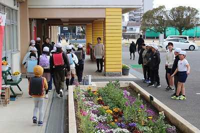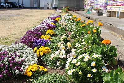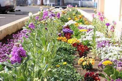 昼間、ぽかぽかと春の気配を感じます。学校でも、学級園や正面玄関のプランターなどの花が見頃を迎え始めました。学校技術員の先生が種から育てた苗を子どもたちが冬になる前に移植したものです。子どもたちが、雑草を取ったり、水をあげたりしてお世話をしています。