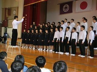 集会には、旭中の合唱コンクールで優勝した3年1組の生徒も来てくれて、合唱を旭小のみんなに聴かせてくれました。響き合う美しいハーモニーに、小学生のみんなは引き込まれていました。熱のこもった上手な合唱を聴いたことはとてもいい経験になりました。中学生のみなさん、ありがとうございました。