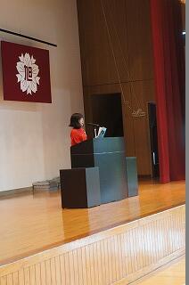 さらに、その後、中学生英語弁論大会の全国大会に出場する、1年生の小野将京さんの発表もあり、表情豊かに、英語を滑らかに話す先輩の姿に、みんなは驚かされました。