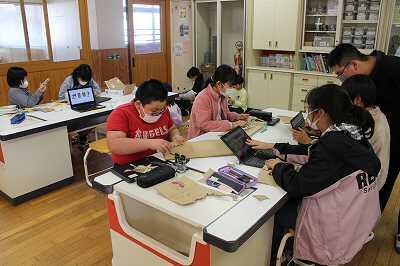 4年生が理科の学習で、数人グループになり、運動場周辺の散策をしていました。「冬の自然を探そう」の学習だそうです。昆虫はほとんど見つけられなかったようですが、膨らみ始めた桜のつぼみやサザンカの花、シロツメグサなどの植物を見つけて、タブレットを用いて写真を撮っていました。