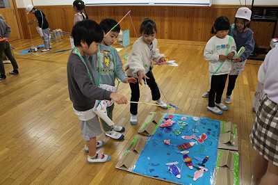 生活科の時間を活用して、2年生が1年生を「おもちゃランド」へ誘って、遊び方を説明して一緒に遊ぶ活動をしています。おもちゃランドは多目的室で、「魚釣り」「ゴムロケット」「ビュンビュンカー」「パッチンジャンプ」等々のコーナーがありました。おもちゃは全て2年生の手作りです。今日は1組、明日は2組と3組だそうです。1年生も2年生も楽しそうでした。