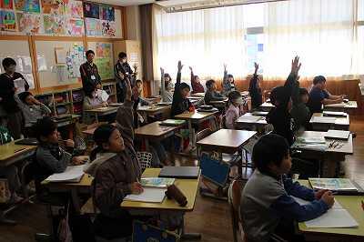 本日、旭小学校で、旭小学校と旭中学校の合同研修会が行われました。これは、小学校6年間と中学校3年間の合計9年間で知・徳・体のバランスのとれた児童・生徒を育てていくために小学校と中学校が連携することを目的に数年前から行われている研修会です。今回は中学校の先生たちに小学校の授業を見ていただきました。子どもたちは緊張しながらも、よく頑張っていました。