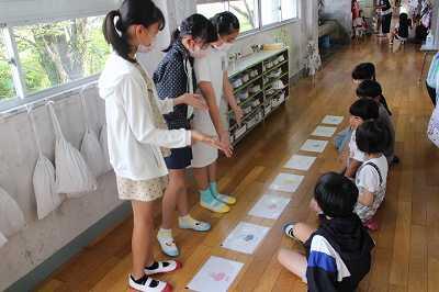 本日、5年生と2年生が、イングリッシュパーティーを行いました。5年生が準備した色々なゲームに2年生が挑戦していきます。5年生も2年生も数名のグループになって、行いました。ここで、大切なことが一つ。5年生はゲームの説明をなるべく日本語を使わずに、英語だけでするということです。5年生は工夫して、ゲームの説明をしたり、進行を行ったりしていました。2年生も5年生の英語を理解しようと一生懸命でした。たくさんの笑顔を見ることができました。
