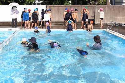 暑い日が続いています。子どもたちが、水泳の学習に意欲的に取り組んでいます。水に顔をつけられるようになった子、伏し浮きや蹴伸びができるようになった子、バタ足ができるようになった子、クロールができるようになった子、平泳ぎで25メートル泳げた子、みんなそれぞれに上達しています。