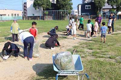 本日の放課後、運動会の練習や運動会当日に向けて、職員作業で1時間ほど、運動場の草抜きをしました。夏季休業中にも予定していたのですが、台風接近で、できなかったものです。運動場に遊びに来ていた子どもたちも手伝ってくれました。