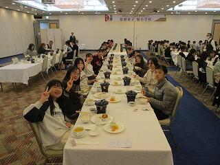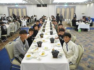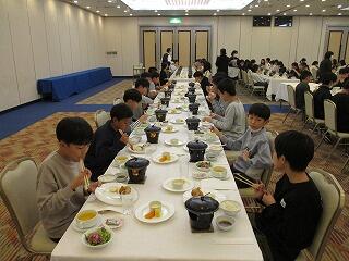 宿泊先のホテルへチェックインしました。それぞれの部屋へ荷物を入れると、お楽しみの夕食の時間です。入館式を行ってからの夕食でした。