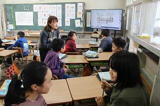 ALTの先生のところへ行く前には、しっかり友達や先生に確認をしています。互いに分からないことがあると教え合い、話せるようになりたいと意欲満々です。