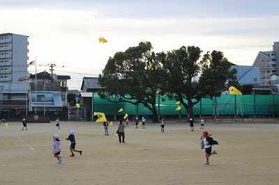 1年生がたこあげをしていました。生活科の「むかしのあそび」で、自分たちでつくった手作りのたこです。今日は、少し寒かったですが、風がほどよく吹いて、たこがよくあがっていました。家でたこをあげるときには、電線(特にJRの高圧線の近くは厳禁)のない、広い場所であげるようにしましょう。