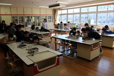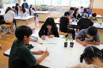 5年生がインゲン豆の発芽について学習していました。ヨウ素液を使ってでんぷんを調べたり、発芽したインゲン豆を観察したりしていました。グループで協力しながら学習をしていました。