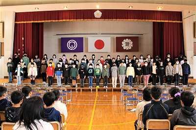 今日、卒業式が行われ、6年生66名が旭小学校を卒業しました。卒業証書授与の後、校長とPTA会長が、夢をもち、夢の実現のために努力したり、工夫したりしてほしいとメッセージを送りました。お別れの歌では、5、6年生の呼びかけや美しい歌声が体育館に響き、目頭を押さえる職員や保護者もいました。卒業生の皆さん、中学校での活躍を応援しています。