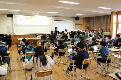 本日、5年生が、オンラインで高千穂小学校の5年生と交流を行いました。外国語の時間に、英語で、お互いの町の自慢できるところを紹介したり、質問をしたりしました。旭小の子どもたちは、城山や鮎、チキン南蛮などを紹介し、高千穂峡や高千穂牛、神楽などに質問をしていました。笑顔で交流をしていました。