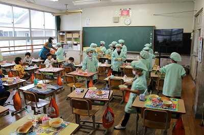 本日から、令和6年度の給食が始まりました。2年生の給食当番は、5年生にお手伝いしてもらいながら、がんばっていました。また、今回、PTAの予算で全校分の給食着を新調していただきました。新調した給食着は、うぐいす色で、ノンアイロンです。ですから、洗濯後にアイロンをかける必要がありません。