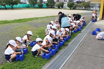 1年生がまいたアサガオの種が芽を出しました。2年生はミニトマトの苗を植えて、その成長を観察しています。1年生も2年生も毎朝の水やりが日課となっています。
