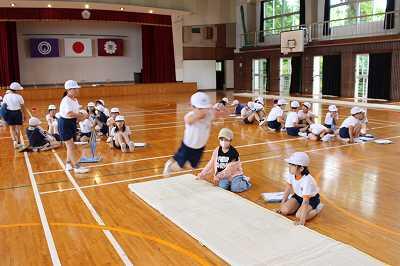 2年生が「新聞となかよし」という工作にチャレンジしました。たくさんの新聞紙を使って、色々なものを自由に使っていました。帽子や洋服、マント、剣、旗、ぬいぐるみ、布団、ベッド、家、秘密基地・・・。楽しそうな声が響いていました。