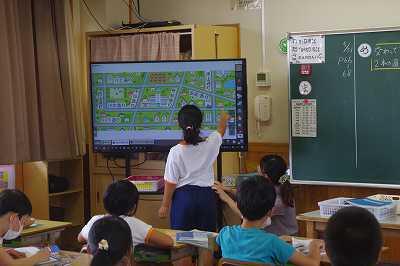 3時間目は、3の1の社会。延岡市の交通がどのように広がっているか調べ理解する学習です。「鉄道」「高速道路」「船」「バス」の4つの班に分かれて調べた子ども達が、その後自分の班に戻り、自分の調べたことを、責任をもって自分の班のメンバーに伝えるという「ジグソー法」という手法を使った学習でした。全員が意欲的に取り組んでいました。↓