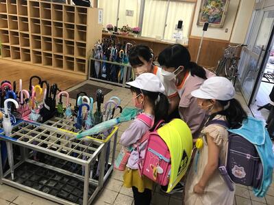 玄関では、6年生が、傘を立てる場所や靴箱の位置などを、やさしく教えてあげていました。