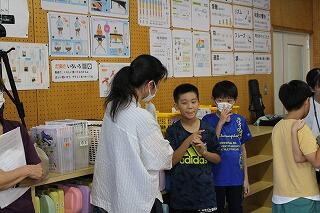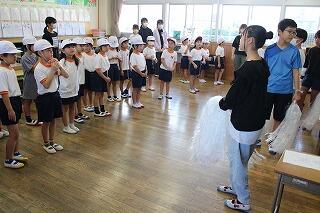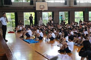 団長は全校の児童が見守る中、ペットボトルを振ると、色が出てきました。色が分かった瞬間、あちらこちらから歓声が沸きました。