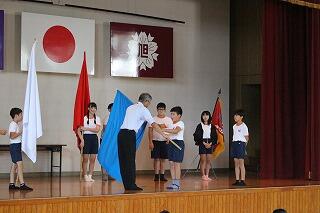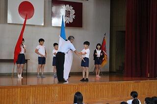 校長先生から団長へそれぞれの団旗が渡されました。