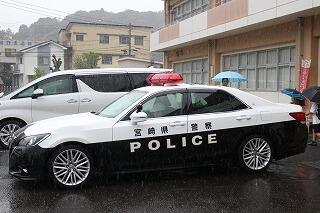 あいにくの雨の中でしたが、6年生の代表児童がパトカーに乗車し、「登下校時に通学路の白線の内側を歩くことや横断歩道を渡るときには、腕を上げ左右を確認してから渡ることを守りましょう。」と呼びかけました。