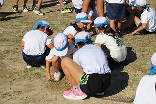 計画していた練習を終えた後は、全校児童による運動場整備です。全校児童が安全に徒走やリレー、団技、ダンスができるように『石拾い』と『草抜き』を頑張りました。