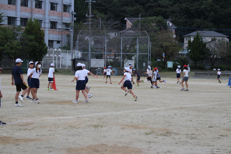 1年生から6年生までの選手が運動場に集まりました。学年ごとに分かれてバトンパスの練習をしました。