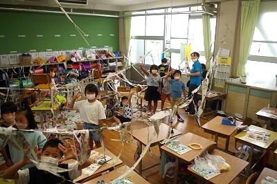 廊下には、1年生がアサガオの汁で紙を染めてつくったアサガオの花もきれいに咲いていて、みんなの心を和ませてくれています。