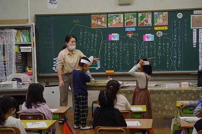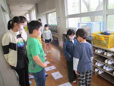 令和4年11月28日(月)、5年生がホスト役になって2年生に英語で説明して英語のゲーム(フルーツバスケットやミステリーボックス、一本橋ゲーム、スイカ割りゲームなど)を楽しんでもらうという取組を行っていました。2年生もとても楽しそうに色やフルーツ、動物、真っ直ぐ歩け、右を向けなどの英語にふれ合っていました。