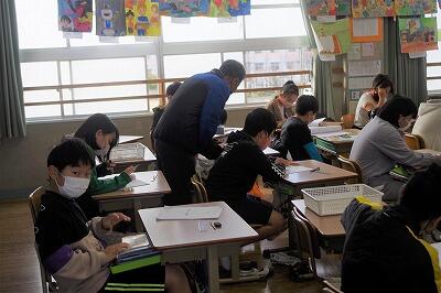 授業の場所が多目的室だったことやたくさんのお客さんが来られていたことなどから、子どもたちはいつもより緊張していたようでしたが、「工夫しながら、小学校生活の思い出を伝え合う」という活動を、途中タブレットをつかって自分の表現を振り返ったりしながらがんばっていました。