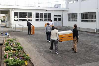 本校の体育館で、多目的トイレの新設工事が始まります。本校の体育館は避難所に指定されていますが、多目的トイレが設置されていないからです。本校の職員が、跳び箱やマット、平均台などを工事の邪魔にならないところへ片付けました。約1ヶ月の工事の期間中も体育館は使用できるそうです。