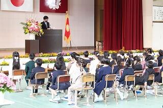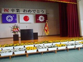 新型コロナウイルス感染拡大防止のため臨時休業が続く中、卒業生と保護者、職員で卒業式を行いました。当初の予定より少ない人数の式になりましたが、在校生のメッセージや来賓の方々の思いを校長先生が式辞で述べられたので、多くの人が卒業を祝っていると実感できる式となりました。会場の見事な花々が、文字通り卒業に花を添えてくれました。