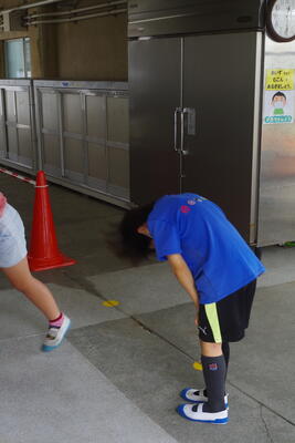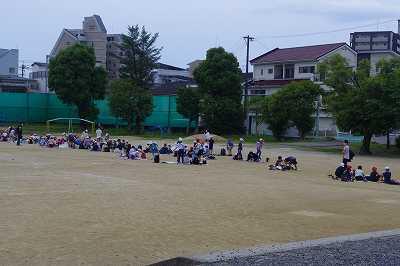 昼休みの途中、放送で音楽が流れ、「給水タイム」のお知らせが入ります。下記はちゃんと、きまりを守って水分補給をしている子ども達です。(遊びに夢中でしない子もいます・・・。お家でも熱中症の怖さ、水分補給の大切さを話してください)