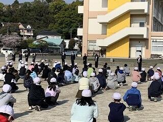 令和4年6月1日(水)、不審者避難訓練を行いました。県警のスクールサポータに不審者役になってもらって、南校舎玄関で職員が対応する訓練を行い、その後体育館で、声かけ事案に係る講話やデモンストレーションを行ってもらいました。デモンストレーションやお礼の挨拶は、6年生がしっかり行ってくれました。↓