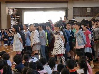 6月3日に今年度最初の音楽集会がありました。発表したのは6年生です。一生懸命練習してきた成果を十分に発揮し,「語り合おう」ではソロのパートと全員での合唱で素晴らしい歌声を,「八木節」では和の響きの迫力ある演奏を披露しました。日頃の感謝の気持ちを込めて音楽集会に来ていただいた安全ボランティアの方にも喜んでいただけました。