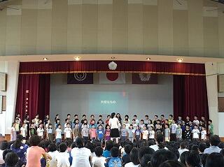 7月1日(土)は音楽集会で5年生が発表しました。「大切なもの」の合唱と「ゴジラ」の合奏でした。音楽集会に向けて約一ヶ月間、昼休みも返上で練習を積み重ねてきました。合唱では間奏の時に自分たちが思う大切なものを発表するという演出も入れました。「家族」「命」「時間」「自然」「思い出」など、大切に思う理由と共に発表しました。