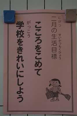次に、清掃担当の先生から、今月の生活目標の話。掃除の時間やそれ以外でも、下記に「3つの玉」を発揮して、学校をきれいにしましょうという話がありました。