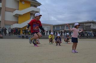 まず、各学級代表の子どもたちが短縄模範演技を披露しました。縄を巧みにあやつり、どきどきしながらも一生懸命に跳ぶ様子が見られました。子どもたちからは、「がんばれ!」の応援や「すごいな。」という歓声が沸き、大変盛り上がりました。