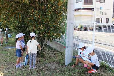1年生が、国語の「しらせたいな、みせたいな」の学習で、伝えたいことを探していました。花壇のお花やキンモクセイ(今、花が咲いていて、よい香りがします)、ダンゴムシなど思い思いに、題材探し、題材選びをしていました。ひらがなを学習していた1年生が、作文を書けるようになりつつあります。がんばっていますね。