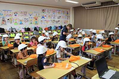 本日、竜巻を想定した非常時訓練を行いました。各学級で、竜巻の恐ろしさや竜巻が来た時に気を付けることなどを勉強しました。次に、実際に竜巻を想定して、「竜巻が来ます」という放送を聞いて、ヘルメットをかぶり、机の下などに隠れる練習をしました。1年生は初めての訓練でした。